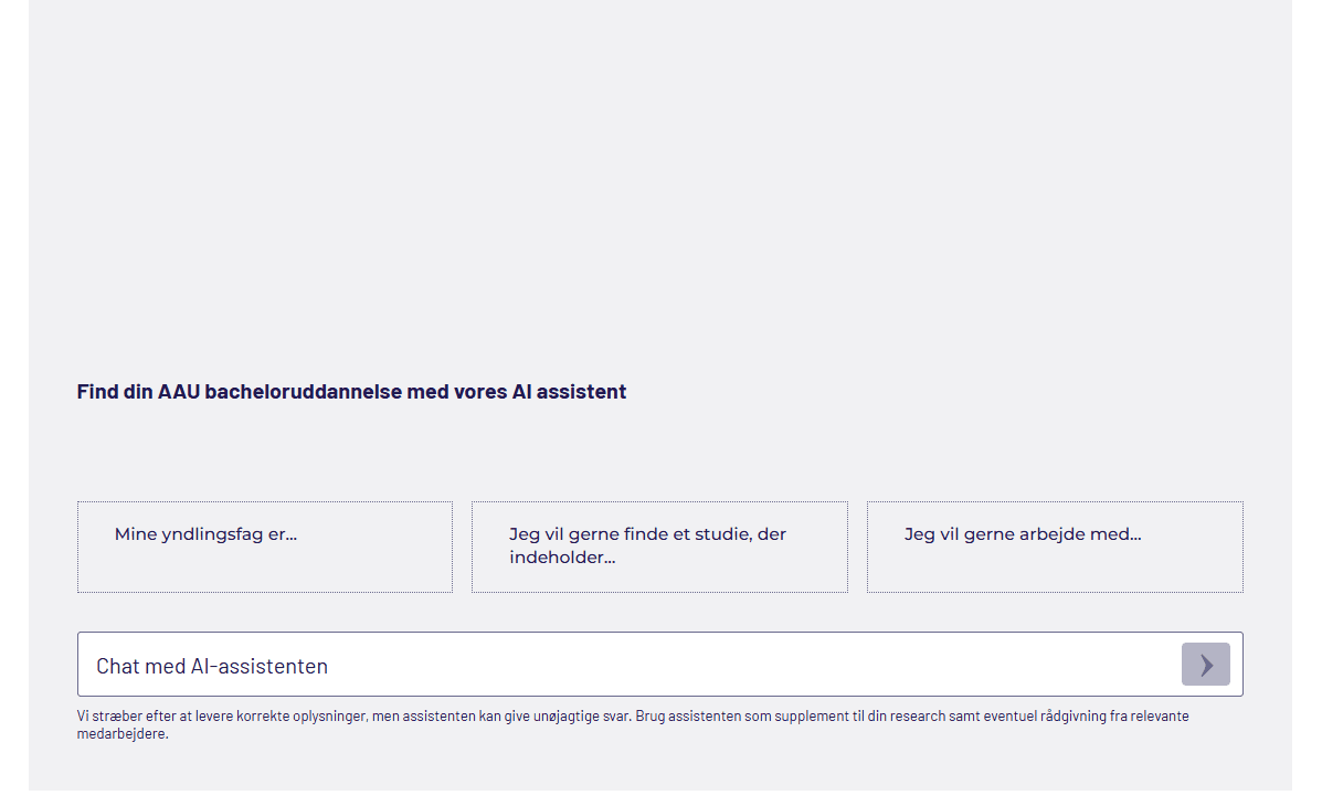 AI studievælgeren er en chatassistent, som skal hjælpe potentielle AAU studerende med finde frem til, om AAU har uddannelser, der passer til deres interesser, fag, karakterer, fremtidsønsker m.m. Studievælgeren er god til at sammenligne potentielle uddannelser.
